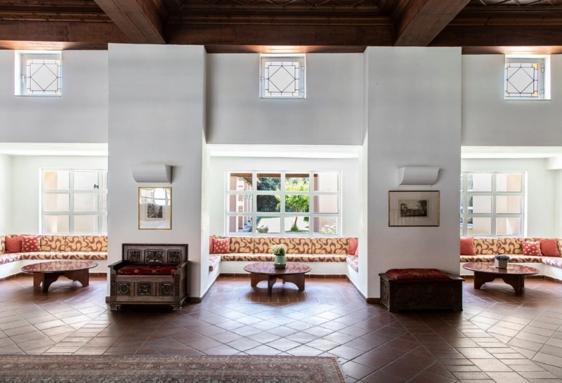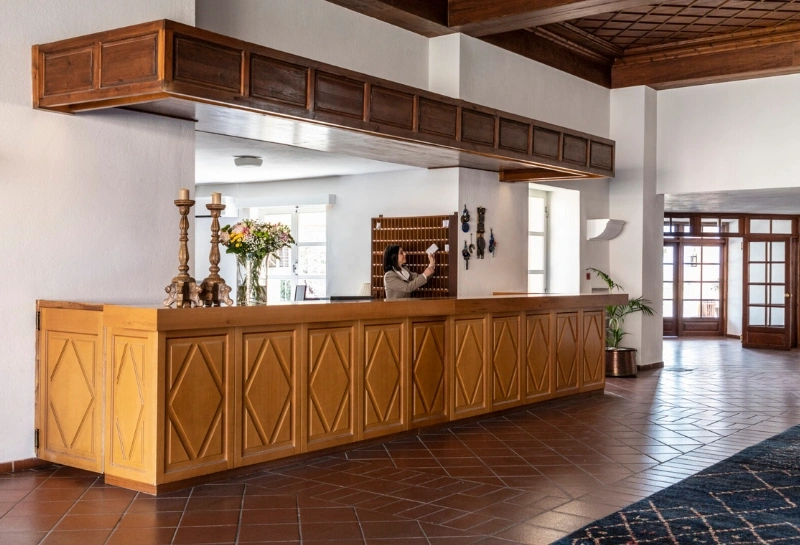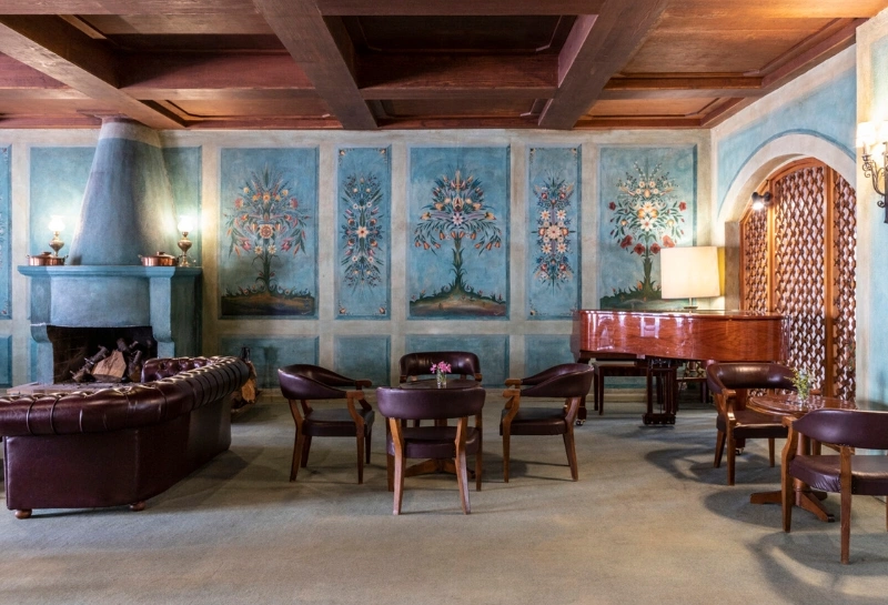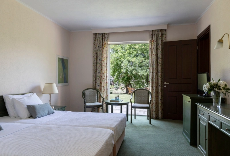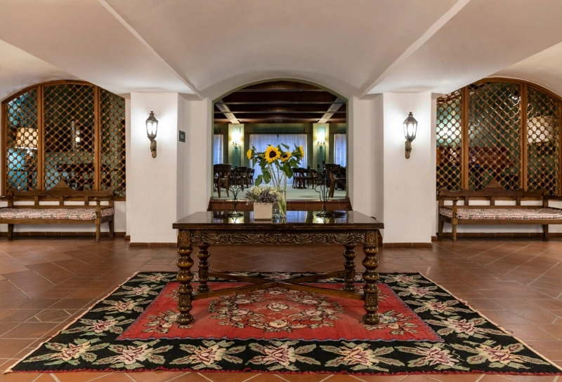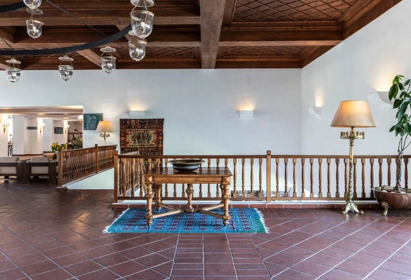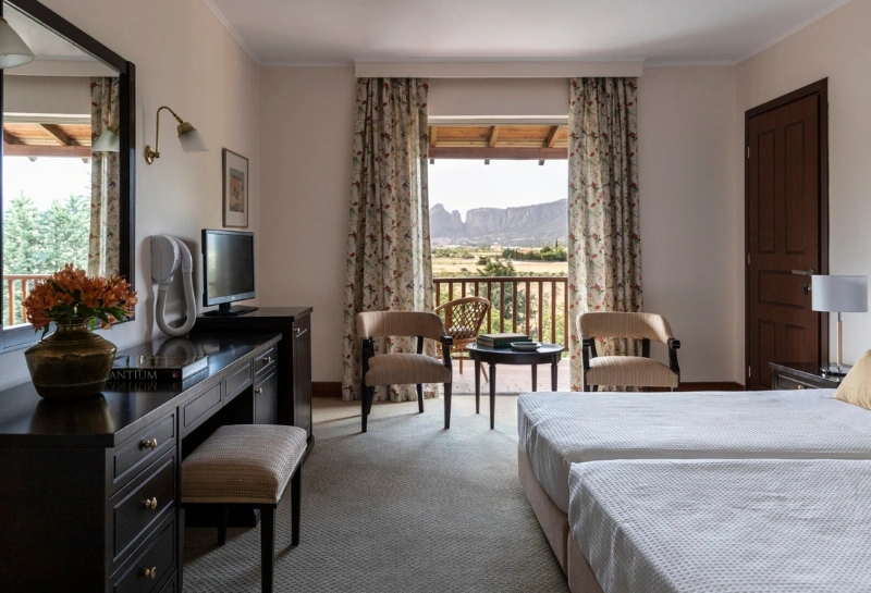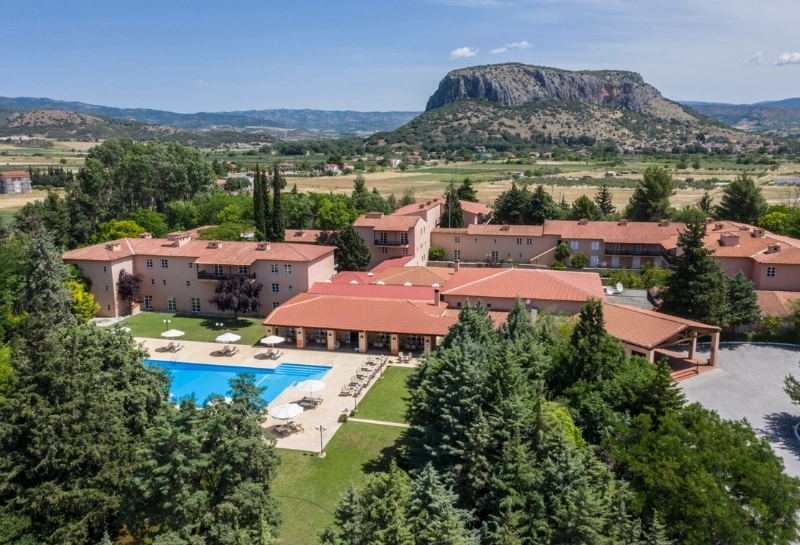 Το όμορφο τοπίο ολοκληρώνεται με τεράστιους κήπους, μια μεγάλη πισίνα και εκπληκτική θέα στους βράχους των Μετεώρων. Το υπέροχο και ευρύχωρο λόμπι σας καλωσορίζει μπαίνοντας στο κεντρικό κτίριο, αγκαλιάζοντάς σας με μια ζεστή ατμόσφαιρα που δημιουργούν οι ξύλινες και σιδερένιες λεπτομέρειες και τα όμορφα χειροποίητα χαλιά. Μην παραλείψετε το café δίπλα στην πισίνα για ποτά και σνακ, το bar και το lounge με τζάκι για τις ζεστές νύχτες του χειμώνα. Το ξενοδοχείο φιλοξενεί τους επισκέπτες του σε ευρύχωρα και άνετα δωμάτια, όλα με θέα στο καταπράσινο τοπίο τριγύρω. Επίσης διατίθενται αίθουσες και εξοπλισμός για συνέδρια και κοινωνικές εκδηλώσεις.