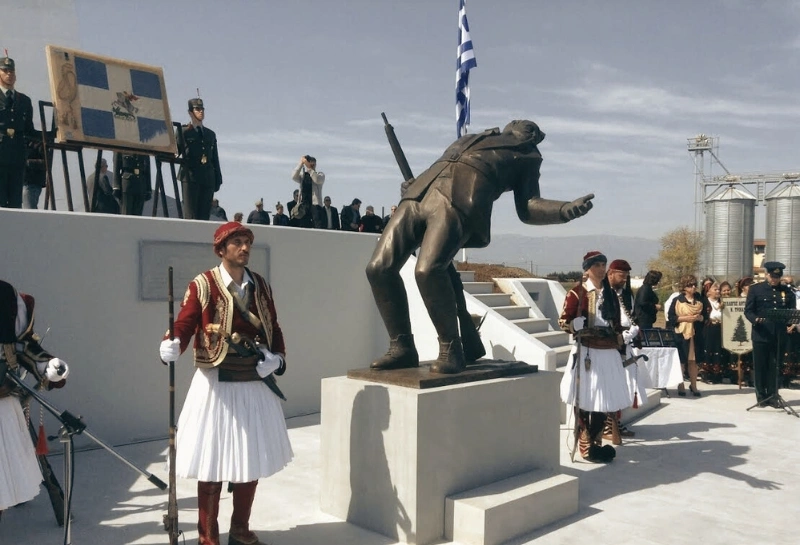• Γλυπτό τραυματία στρατιώτη μπροστά από τις πυραμίδες, που συμβολίζει την Ελλάδα τραυματισμένη αλλά όρθια.